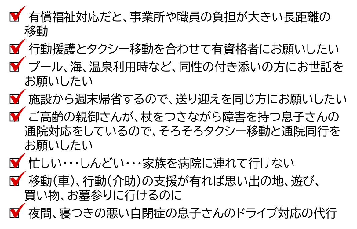 対象者はケガや病気、障害以外にも環境や状況、状態などにより移動や行動に大なり小なり困っている方々です。通院つきそいの他に余暇、レジャー、買い物や用事(思い出の場所めぐり、時間が早まった保育園の送り迎えやお墓参り)など様々な用途で利用可能です。移動、行動の支援、サポートの専門家です。まずはご相談ください。